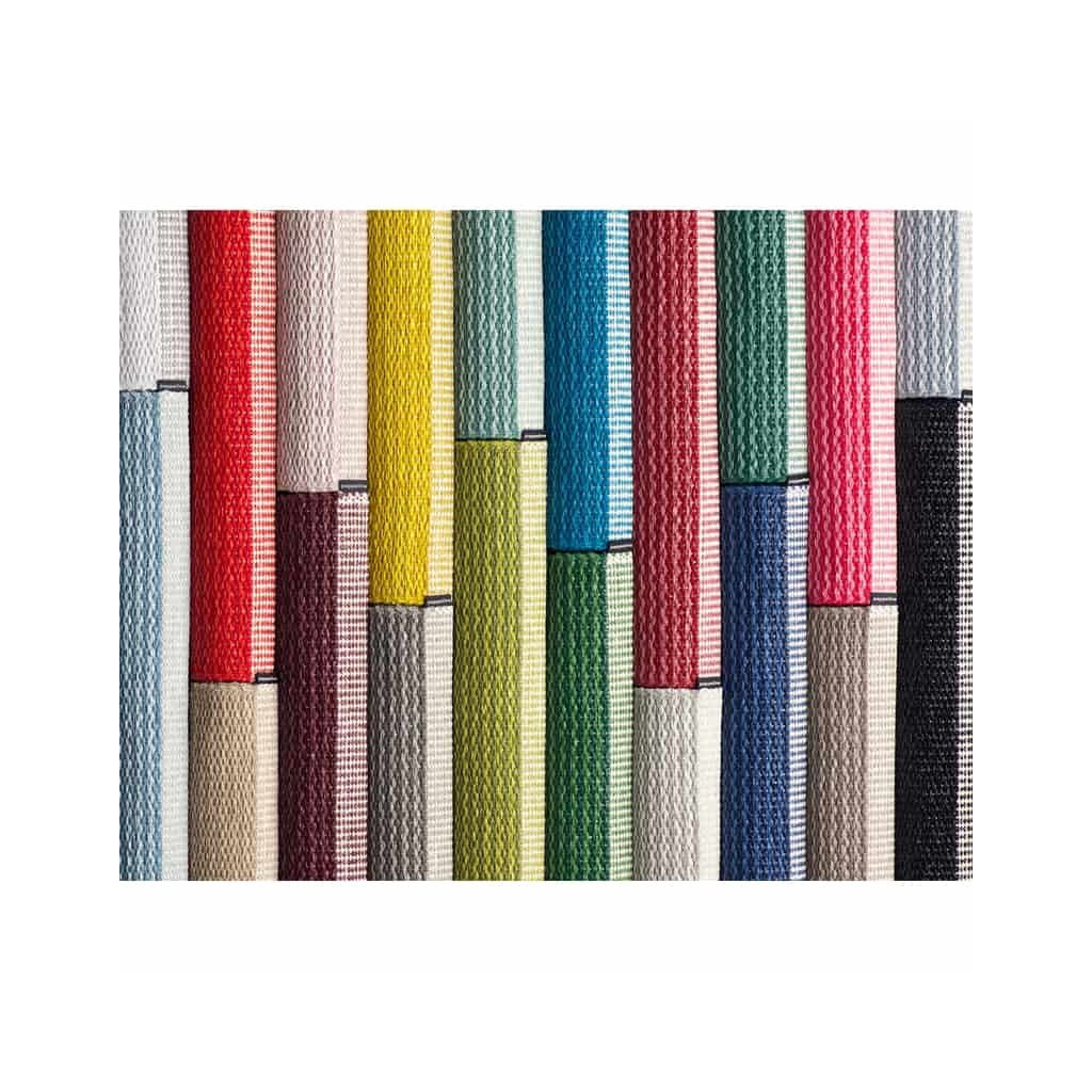 Plastový koberec pro vnitřní i venkovní použití. Vyrobeno ve Švédsku ze švédské certifikované PVC pásky bez obsahu ftalátů, tkané na tradičních stavech pomocí dřevěných člunků.
